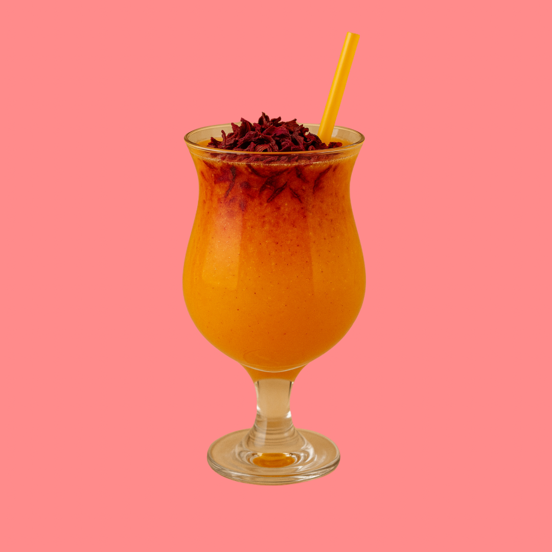 Cocktail fruité local d'orange, pomme, passion, mangue et pétales d’hibiscus